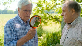 John Craven, the long serving Countryfile presenter, also wanted to talk to Charlie about the importance of the Suffolk dialect . . . and even tried his hand at learning some of the Suffolk dialect in order to introduce the weather forecast using Suffolk phrases. He readily admitted afterwards that he was no Ralph Fiennes. The photograph, courtesy of Toby Hough, BBC Countryfile Director, shows John Craven trying to copy Charlie's mouth movements . . . hence the use of a mirror!